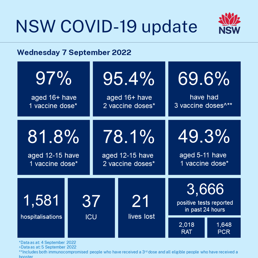 Nsw Health On Twitter Covid 19 Update Wednesday 7 September 2022 In The 24 Hour Reporting Period To 4pm Yesterday 97 Of People Aged 16 Have Had One Dose Of A Covid 19